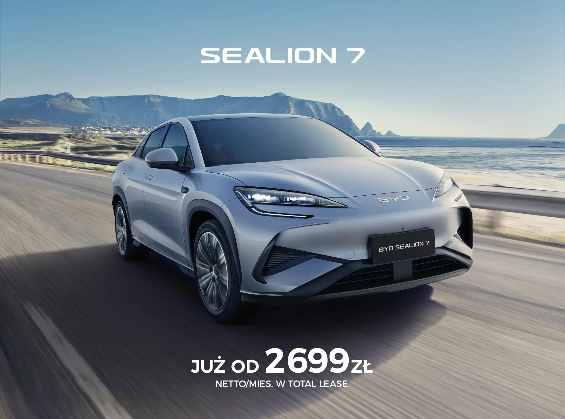 Prezentowana oferta to wartość netto czynszu najmu długoterminowego Programu Total Lease dla auta SEALION 7 w wersji COMFORT. Oferta skalkulowana w oparciu o parametry: opłata wstępna 30.000 zł netto, okres kontraktu 36 miesięcy, przebieg całkowity 30.000 km. Szczegóły promocji dostępne u Dealerów oraz na stronie https://m.yzdtw.com/pl/promocje/finansowanie-1. Dostawcą oferty jest Arval Service Lease Polska Sp. z o.o. z siedzibą w Warszawie przy ul. Wołoskiej 24, 02-675 Warszawa.