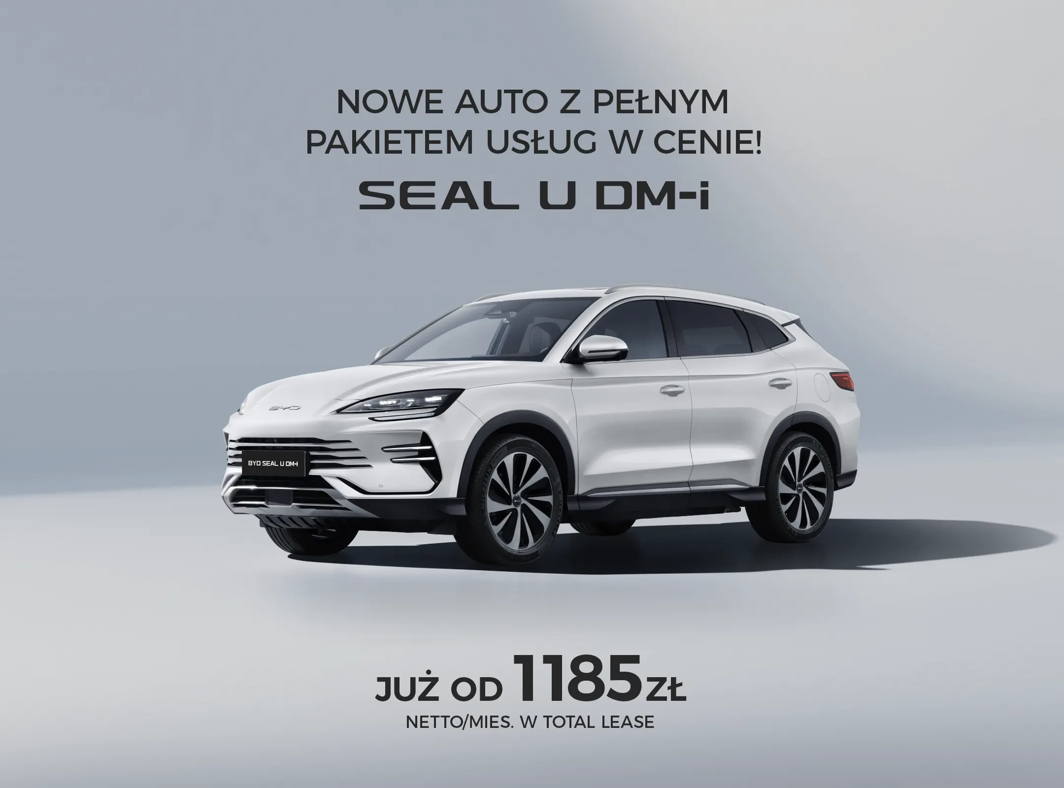 Prezentowana oferta to wartość netto czynszu najmu długoterminowego Programu Total Lease dla auta SEAL U DM-i w wersji COMFORT. Oferta skalkulowana w oparciu o parametry: opłata wstępna 10% wartości samochodu, okres kontraktu 36 miesięcy, przebieg całkowity 30.000 km. Szczegóły promocji dostępne u Dealerów oraz na stronie https://m.yzdtw.com/pl/promocje/finansowanie-1. Dostawcą oferty jest Arval Service Lease Polska Sp. z o.o. z siedzibą w Warszawie przy ul. Wołoskiej 24, 02-675 Warszawa.